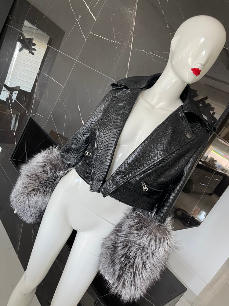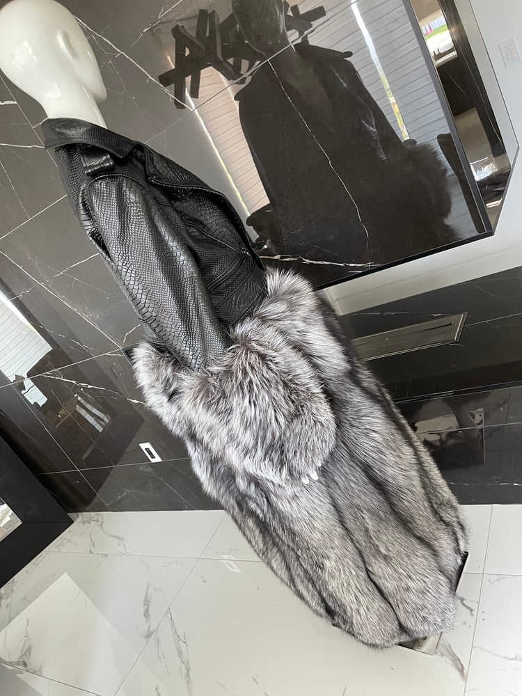 Leather X Fox Fur Coat, can be worn 3 different ways. Wear it as a biker jacket with or without fur cuffs or as a floor length coat.